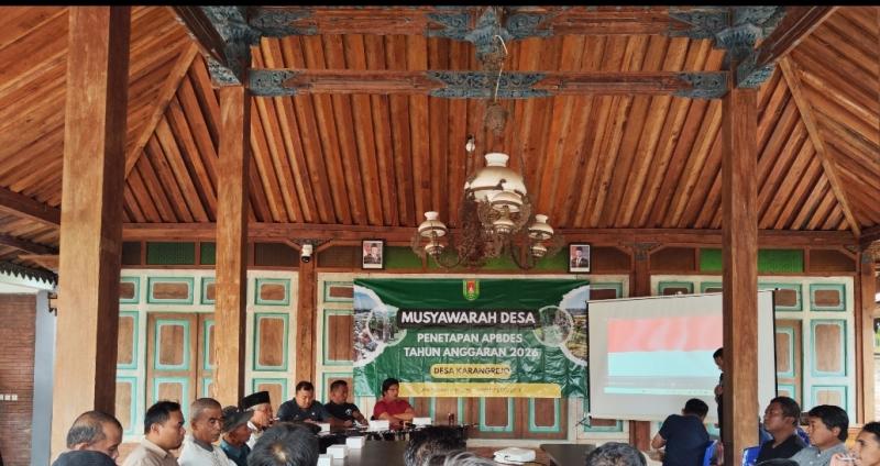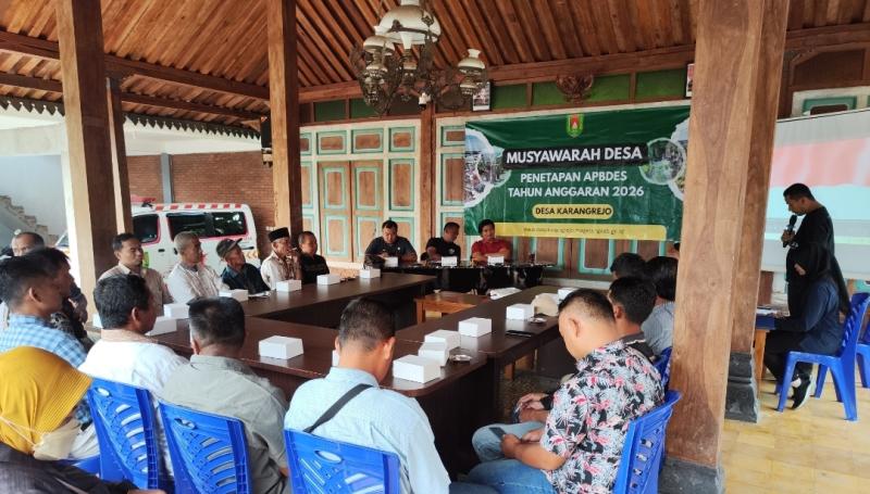 Dalam rangka mewujudkan tata kelola pemerintahan desa yang transparan, partisipatif, dan akuntabel, Pemerintah Desa Karangrejo melaksanakan Musyawarah Desa (Musdes) Penetapan Anggaran Pendapatan dan Belanja Desa (APBDes) Tahun Anggaran 2026. Kegiatan ini dilaksanakan pada hari Jumat tanggal 23 Januari 2026 bertempat di Joglo K. Amat Danom dengan dihadiri oleh berbagai unsur masyarakat desa.