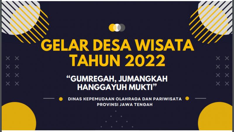 Gelar Desa Wisata yang diselenggarakan oleh Dinas Kepemudaan, Olahraga, dan Pariwisata Provinsi Jawa Tengah kali ini mengangkat tema ”Gumregah, Jumangkah, Hanggayuh Mukti”. Tema ini merepresentasikan semangat kebangkitan seluruh elemen di Desa Wisata untuk pulih lebih cepat, bangkit lebih kuat, dan bergerak bersama menuju kejayaan.