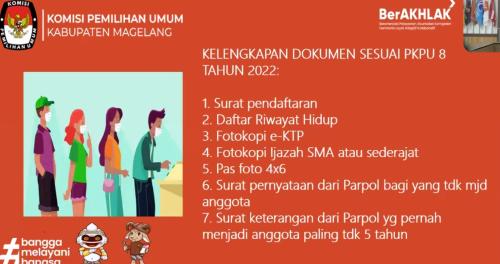 Untuk persyaratannya, kata Rofik, diantaranya warga negara Indonesia ditandai dengan KTP el. Kemudian, sehat jasmani dan rohani, berusia minimal 17 tahun, berpendidikan minimal SLTA atau sederajat, tidak menjadi anggota parpol temasuk tidak menjadi tim kampanye, tim pemenangan, atau saksi peserta Pemilu dan Pemilihan paling singkat 5 (lima) tahun, tidak sedang menjalani hukuman dan lain-lain. "Untuk form-form pendaftaran dan persyaratannya apa saja, bisa di lihat di website dan medsos KPU Kabupaten Magelang. Yang jelas, pendaftarannya melalui Siakba (kpu.go.id))," tegasnya.