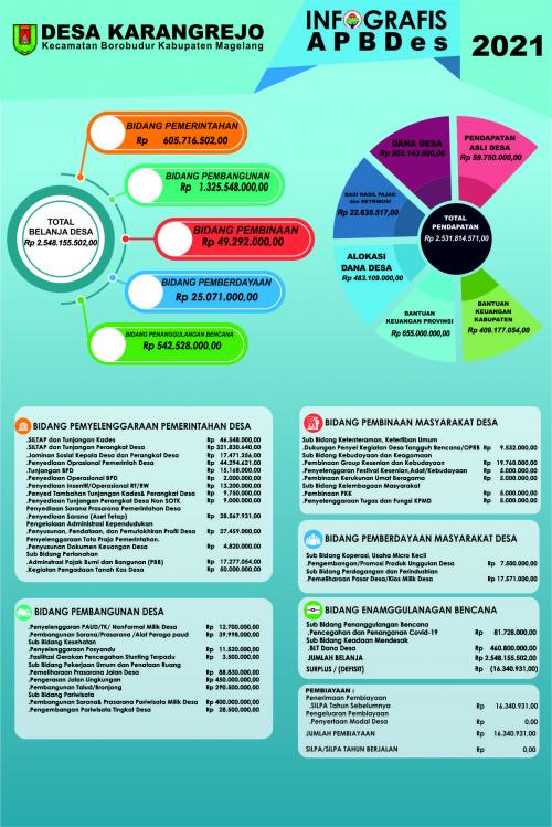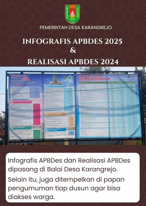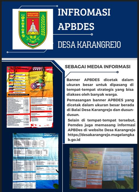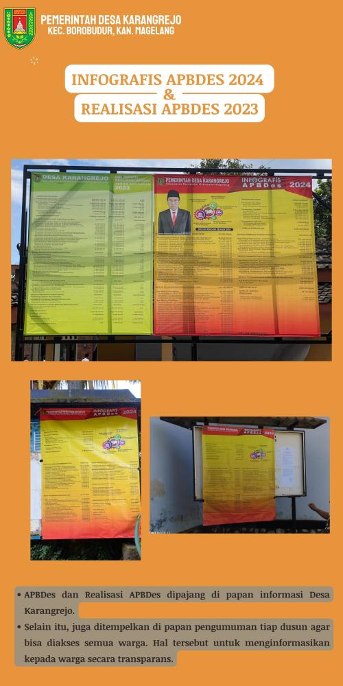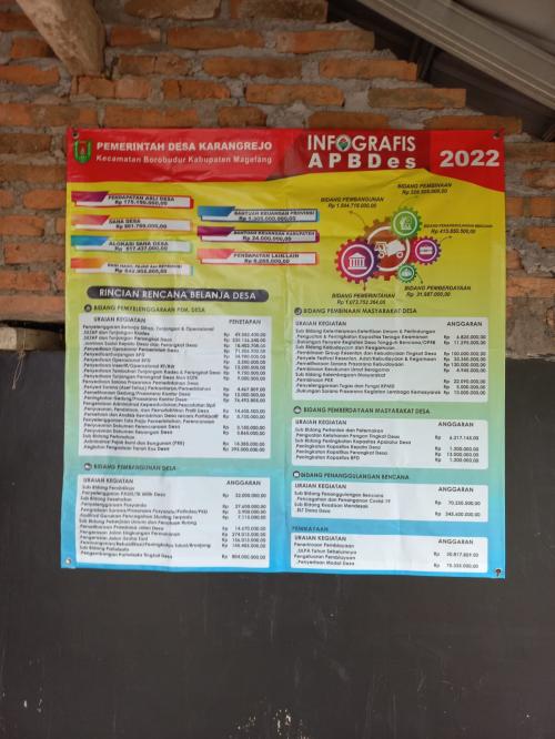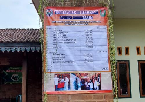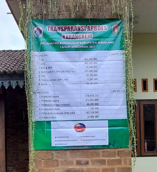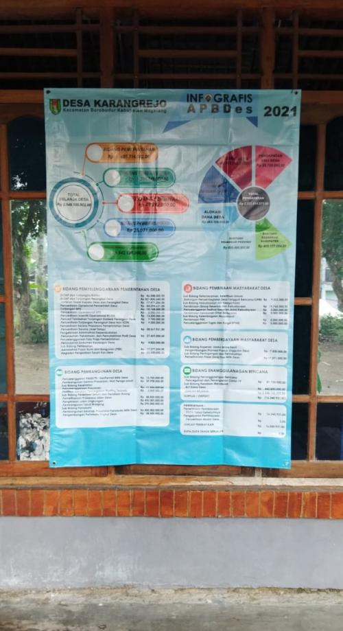 Pemerintah Desa Karangrejo, Kecamatan Borobudur, Kabupaten Magelang tak mau ketinggalan dalam memberikan informasi terkait Anggaran Pendapatan dan Belanja Desa (APBDes). Apalagi, hal itu memang sudah menjadi kewajiban desa.
