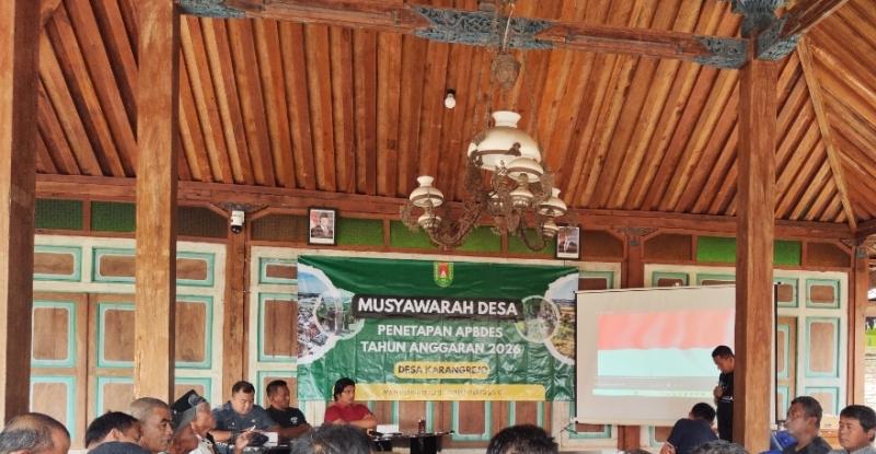 Dalam rangka mewujudkan tata kelola pemerintahan desa yang transparan, partisipatif, dan akuntabel, Pemerintah Desa Karangrejo melaksanakan Musyawarah Desa (Musdes) Penetapan Anggaran Pendapatan dan Belanja Desa (APBDes) Tahun Anggaran 2026. Kegiatan ini dilaksanakan pada hari Jumat tanggal 23 Januari 2026 bertempat di Joglo K. Amat Danom dengan dihadiri oleh berbagai unsur masyarakat desa.