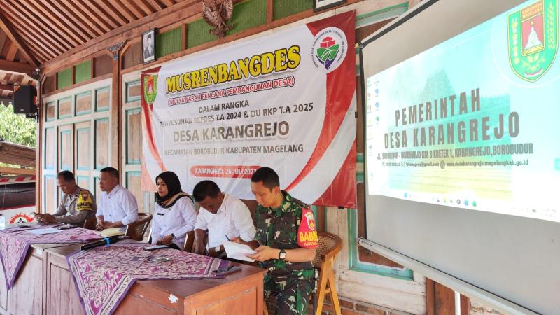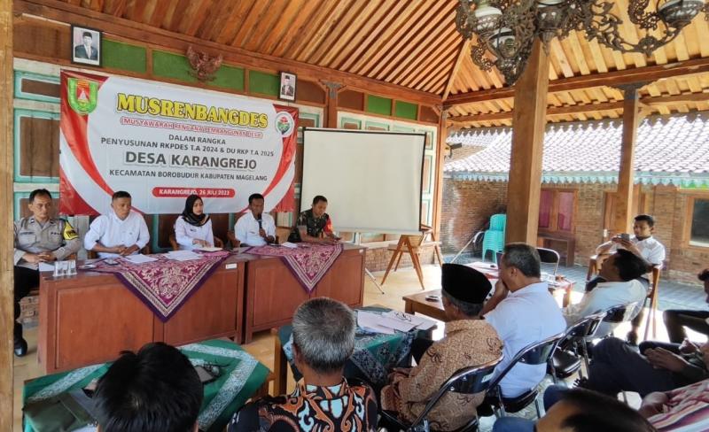 Pemerintah Desa Karangrejo telah melaksanakan Musyawarah Perencanaan Pembangunan Desa, Musyawarah Perencanaan Pembangunan Desa yang selanjutnya disingkat Musrenbang ini dilaksanakan pada hari Rabu tanggal 26 Juli 2023 bertempat di Joglo K.Ahmad Danom, Pemerintah Desa Karangrejo Kecamatan Borobudur, melaksanakan Perencanaan Pembangunan (Musrenbang) desa dalam rangka pembahasan Rancangan RKP Desa Tahun Anggaran 2024 dan Daftar usulan TAHUN 2025. Kegiatan ini merupakan agenda rutin tahunan sebagai implementasi Rencana Pembangunan Jangka Menengah Desa (RPJMDes).