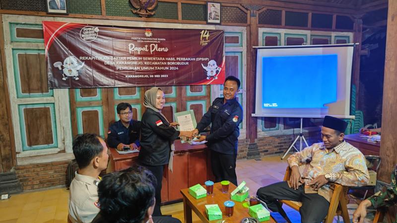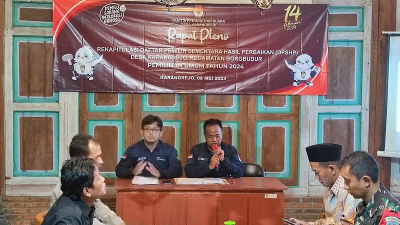 Senin, 8 Mei 2023 bertempat di Joglo K. Ahmad Danom desa Karangrejo di adakan rapat Pleno Terbuka Rekapitulasi Daftar Pemilih Sementara Hasil Perbaikan ( DPSHP ) Pemilu Tahun 2024 oleh Panitia Pemungutan Suara ( PPS ) Desa Karangrejo yang dihadiri Kepala Desa Karangrejo Muhamad Hely Rofikun, Panwascam, PPK Borobudur, Tomas, PKD, Babinsa Desa Karangrejo , Bhabinkamtibmas Desa Karangrejo dan Perwakilan Pengurus Partai Politik Peserta Pemilu 2024 Desa Karangrejo berdasarkan Peraturan Komisi Pemilihan Umum Nomor 7 Tahun 2023 tentang Perubahan Atas Peraturan Komisi Pemilihan Umum Nomor 2 Tahun 2022 tentang Penyusunan Daftar Pemilih Dalam Penyenggaraan Pemilihan Umum dan Sistem Informasi Data Pemilih serta Surat Keputusan Komisi Pemilihan Umum Nomor 27 Tahun 2023 tentang Pedoman Teknis Penyusunan Daftar Pemilih Dalam Negeri pada Penyelenggaraan Pemilihan Umum. Rapat Pleno Terbuka Rekapitulasi Daftar Pemilih Sementara Hasil Perbaikan ( DPSHP ) dipimpin langsung oleh Ketua Panitia Pemungutan Suara ( PPS ) Karangrejo Muhamat Mudangin didampingi 2 orang anggota Muhammad Anif Kurniawan dan Eko Saputro. Hasil Pemutakhiran Data Pemilih Sementara Hasil Perbaikan oleh PPS Desa Karangrejo sejumlah 2214 pemilih dengan rincian sebagai berikut :