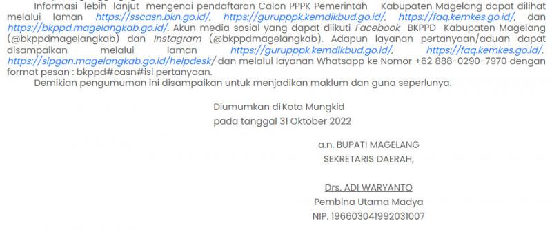 Berdasarkan Keputusan Menteri Pendayagunaan Aparatur Negara dan Reformasi Birokrasi Republik Indonesia Nomor 479 Tahun 2022 tentang Penetapan Kebutuhan Pegawai Aparatur Sipil Negara di Lingkungan Pemerintah Kabupaten Magelang Tahun Anggaran 2022, memberikan kesempatan kepada Warga Negara Indonesia untuk bergabung sebagai Calon Pegawai Pemerintah Dengan Perjanjian Kerja (Calon PPPK) Pemerintah Kabupaten Magelang, dengan ketentuan sebagai berikut: